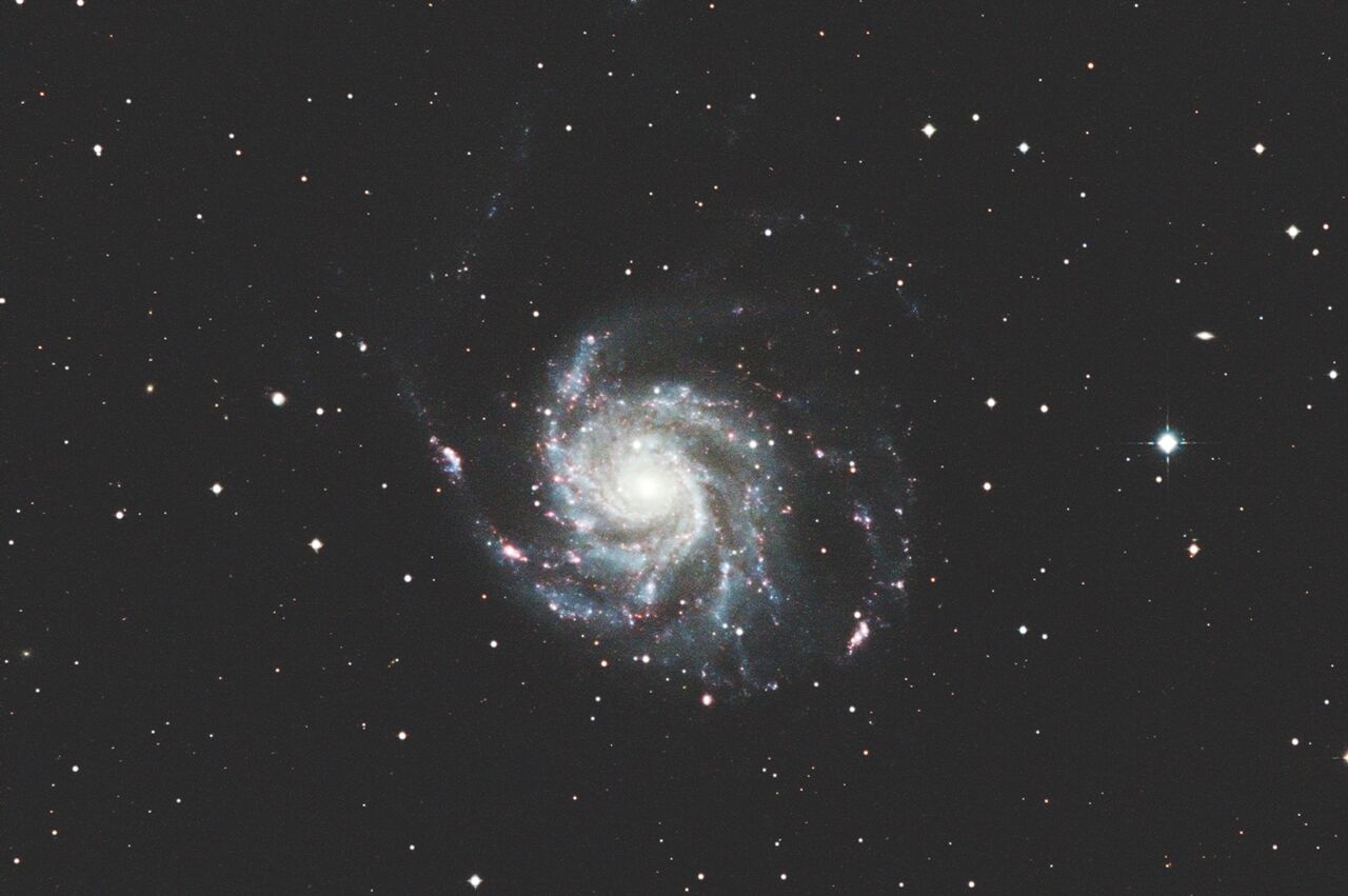 さて本日ご紹介する画像はおおぐま座のM101回転花火銀河でございます。このM101銀河は丁度銀河を真上から渦の広がりを見る事ができるので、大きく伸びた腕を美しく観察する事が出来ます。